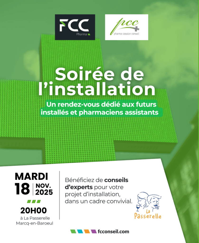 Le mardi 18 novembre, notre cabinet FCC et le cabinet de transaction PCC vous invitent à une soirée d’information et d’échanges dédiée aux pharmaciens adjoints et futurs installés.